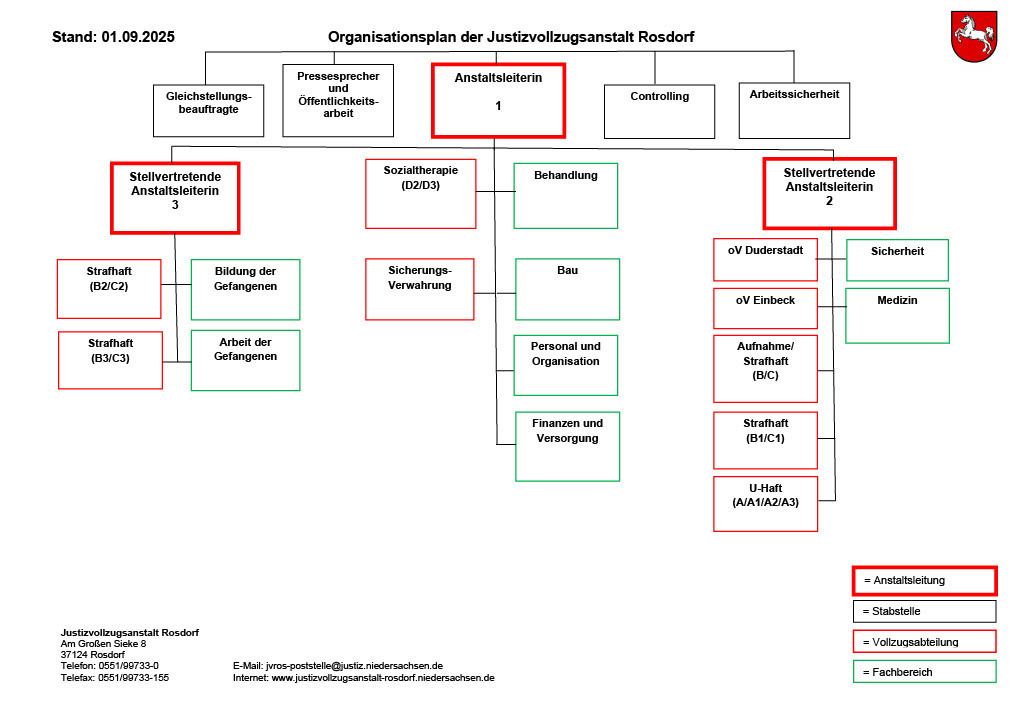 An der Spitze der JVA Rosdorf steht der Anstaltsleiter und deren ständige/r Vertreterin bzw. Vertreter, die jeweils für unterschiedliche Vollzugsabteilungen und Fachbereiche verantwortlich sind.